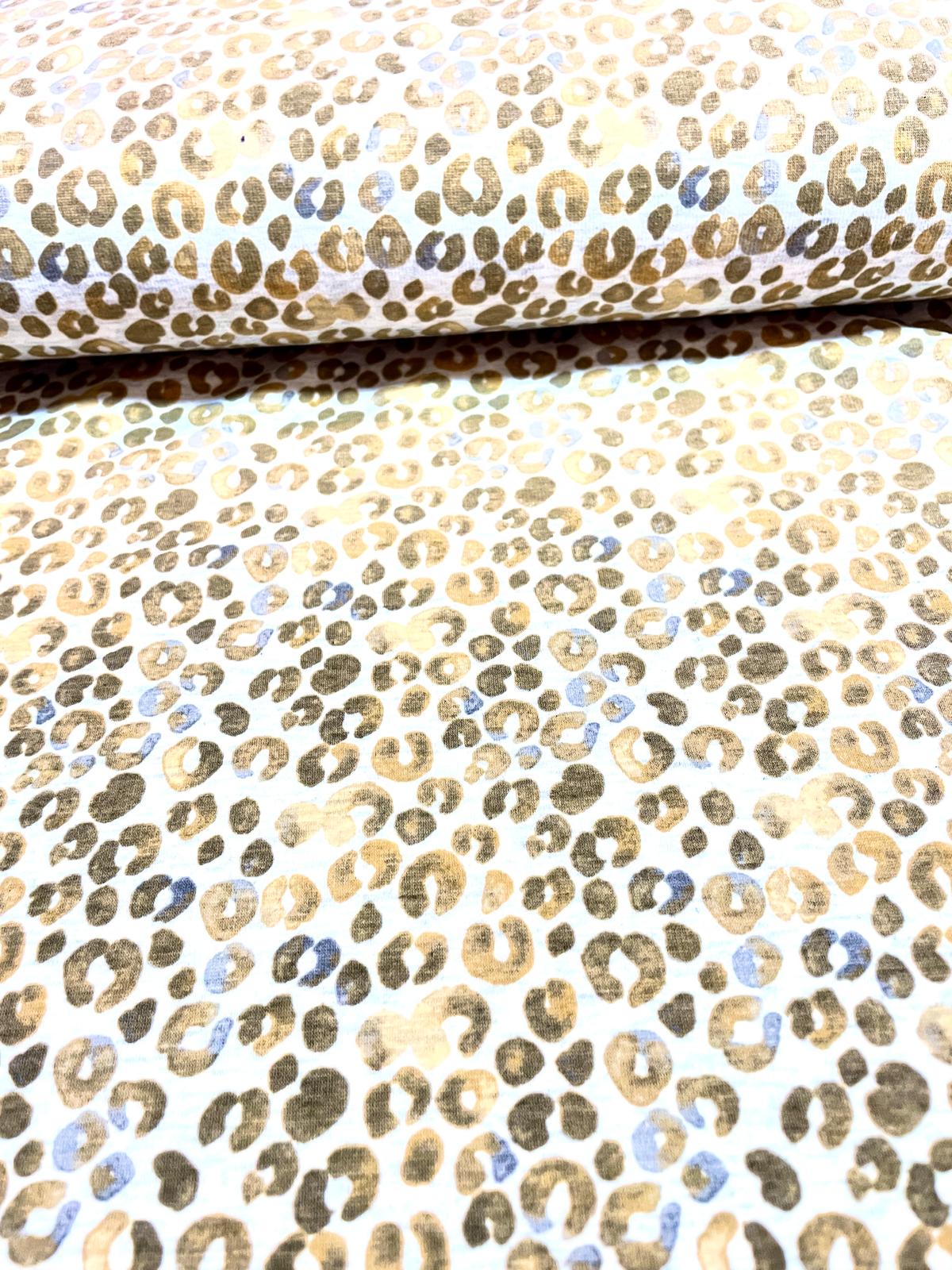 Dieser Alpenfleece präsentiert sich in einem modernen, hellen Leopardenmuster. Die Sprenkel sind in warmen Ocker- und Brauntönen gehalten, die leicht mit Graunuancen durchzogen sind und auf einem hellen, grau/cremehellen Hintergrund leuchten.