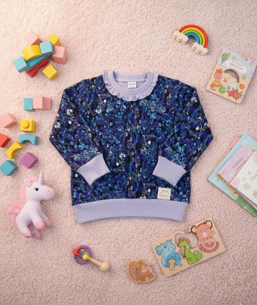 Dieser Alpenfleece besticht durch sein lebhaftes, abstraktes Sprenkel-Muster auf schwarzem Grund. Die intensive Farbpalette umfasst leuchtendes Königsblau, Türkis, Violett und Lila, akzentuiert mit Tupfern in Grün und Weiß. Die Musterung wirkt modern und dynamisch.