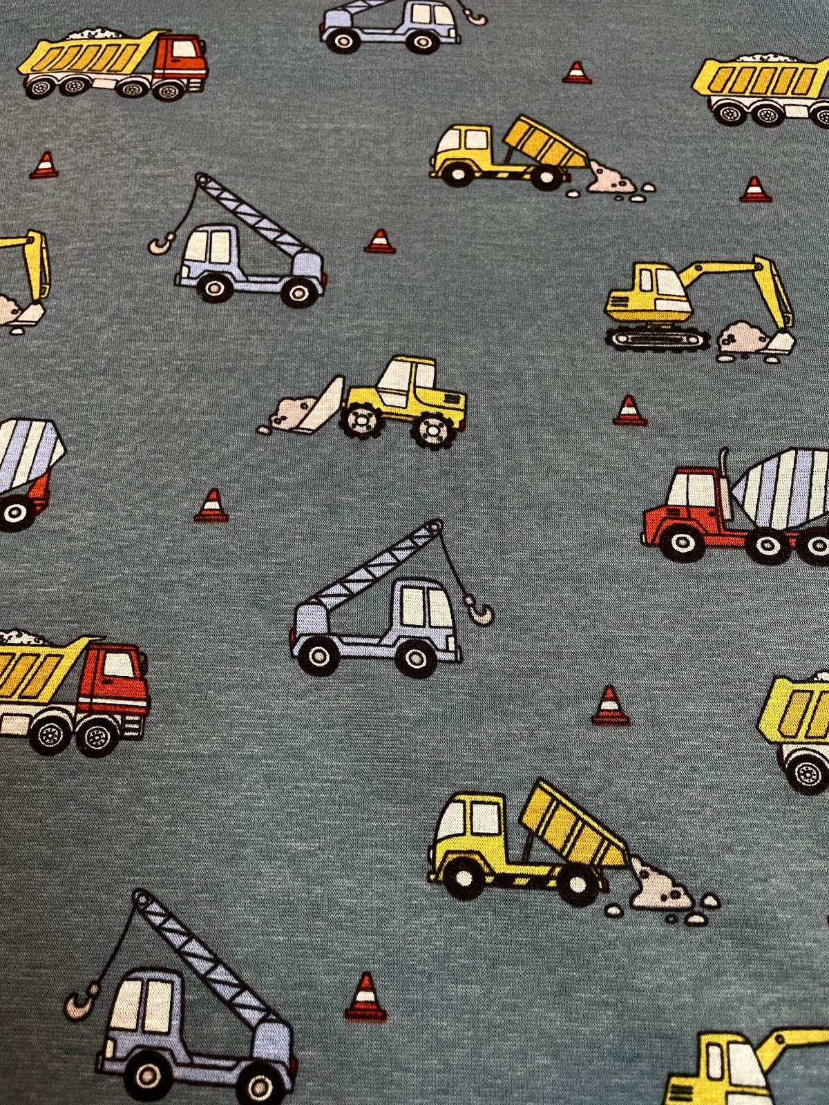 🚧Es handelt sich hierbei um Alpenfleece in einem melierten Blau /Grau-Ton. Die glatte Außenseite ist mit niedlichen Baustellenfahrzeugen (Kran, Bagger, Muldenkipper) bedruckt. Die Innenseite ist typischerweise ein dicker, weicher Fleece.
