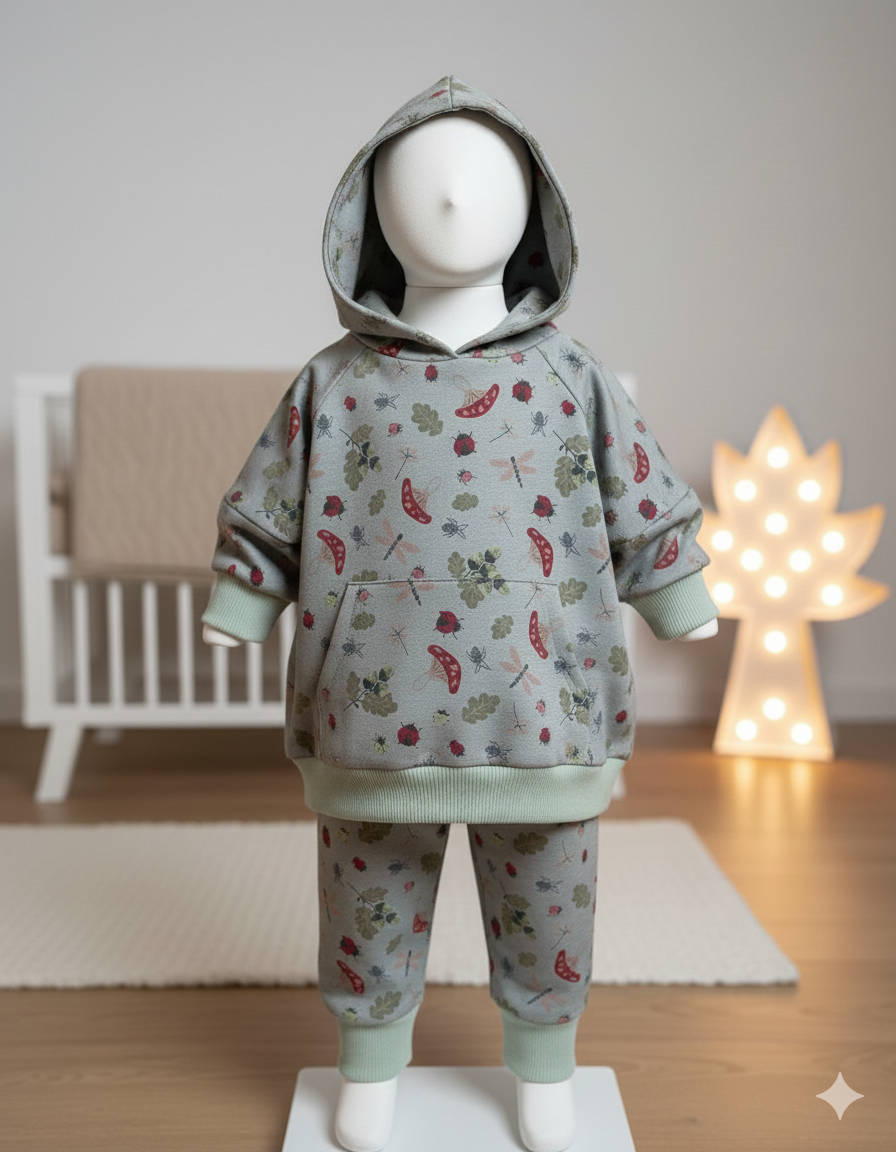 Dieser zauberhafte Alpenfleece Stoff ist mit einem liebevollen Natur- und Waldmuster bedruckt, ideal für kleine Entdecker. Auf dem altgrünem Hintergrund tummeln sich detailreiche Eichenblätter, rote Pilze, Marienkäfer und Libellen.