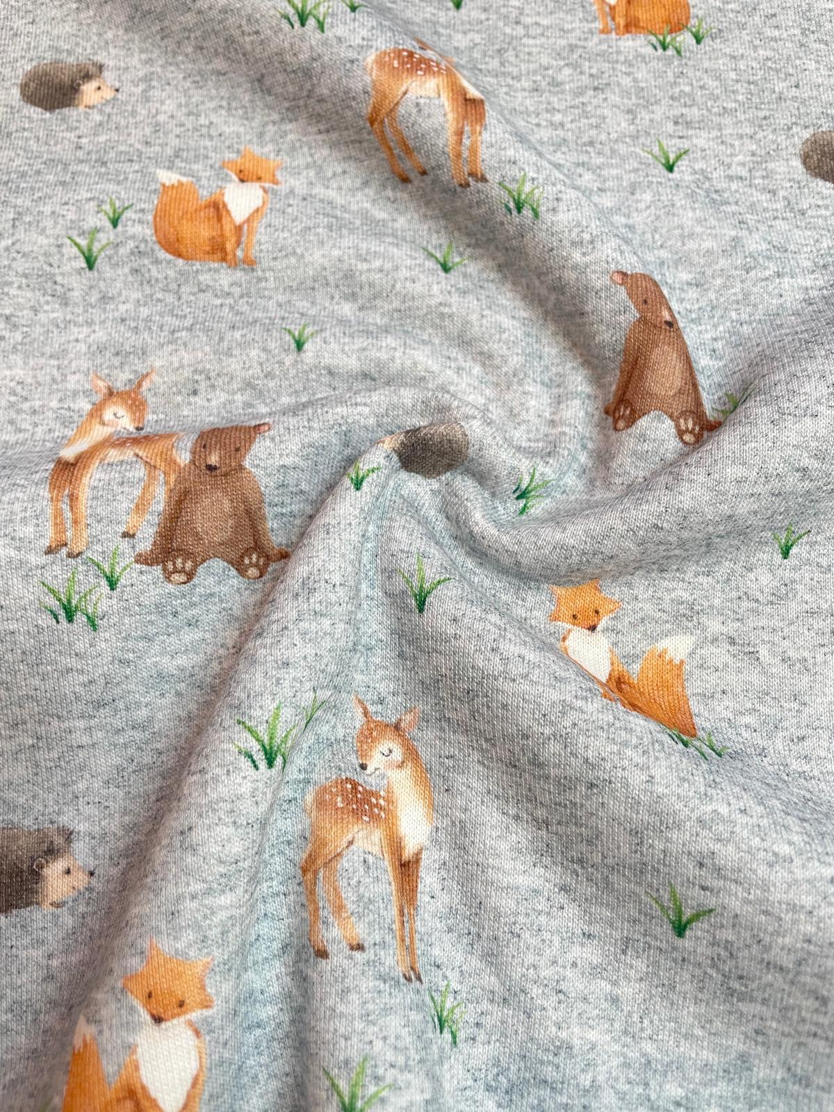 Dieser Stoff ist ein Alpenfleece – das bedeutet, er besteht auf der Vorderseite aus einem weichen, dehnbaren Sweat-Stoff) und auf der Rückseite aus einem warmen, kuscheligen Polyester-Fleece. Die Vorderseite zeigt eine helle, neutrale Grundfarbe in Grau-Meliert. Bedruckt ist sie mit einem charmanten Allover-Print von verschiedenen Waldtieren wie Rehen/Hirschkühen, Füchsen, Bären und Igeln. Diese Tiere sind in einer liebevollen, naturverbundenen Aquarell-Optik gehalten und stehen zwischen stilisierten, grünen Grashalmen. Die Rückseite ist unifarben hell und sorgt für einen besonders hohen Tragekomfort und Wärmeisolierung. Der Stoff eignet sich durch seine Dicke und Flauschigkeit perfekt für warme Hoodies, Pullover, Jacken, Mützen und gemütliche Loungewear für die kältere Jahreszeit.