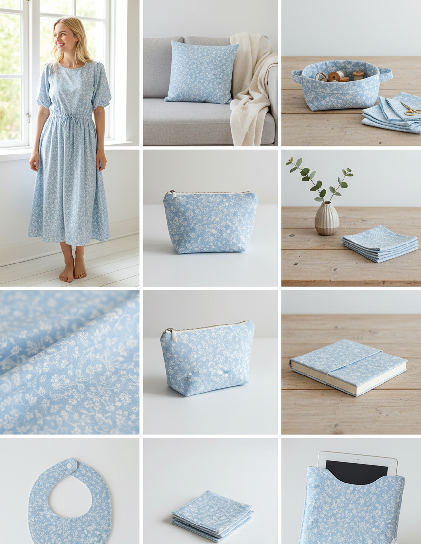 Zarter Blütentraum in Hellblau – Hochwertiger Baumwollstoff für romantische Designs