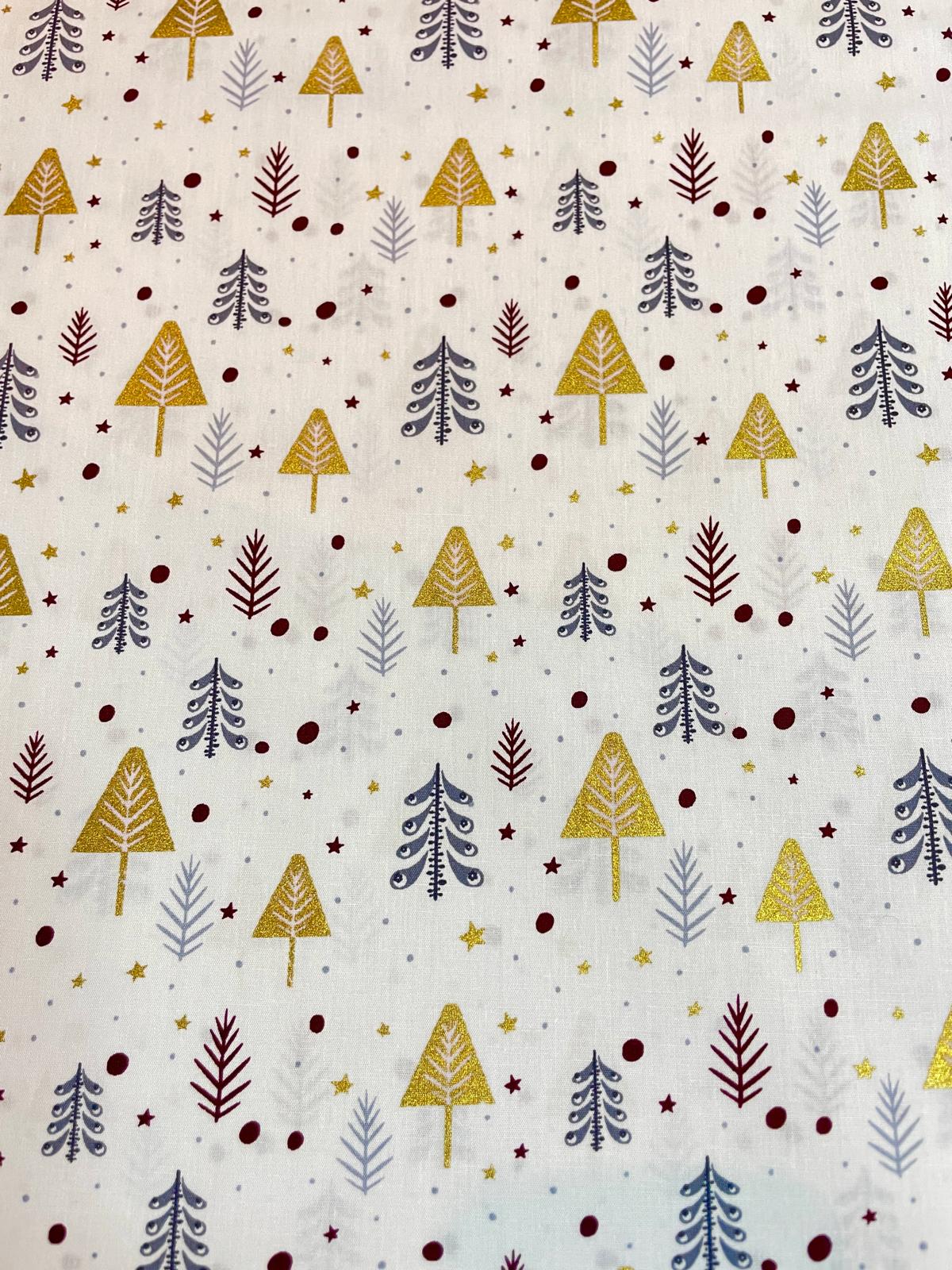 Dieser weißgrundige Baumwollstoff präsentiert ein modernes, vielseitiges Tannenbaum-Muster in einer eleganten Farbkombination. Das Design besteht aus stilisierten Bäumen in Grau, dunklem Bordeaux/Weinrot und auffälligen, geometrischen Bäumen mit einem leuchtenden Goldglitter-Effekt. Akzentuiert wird der Stoff durch kleine Sterne und Punkte. Der Baumwollstoff ist weich und atmungsaktiv und eignet sich hervorragend für festliche Dekorationen und schicke Weihnachts-Accessoires.
