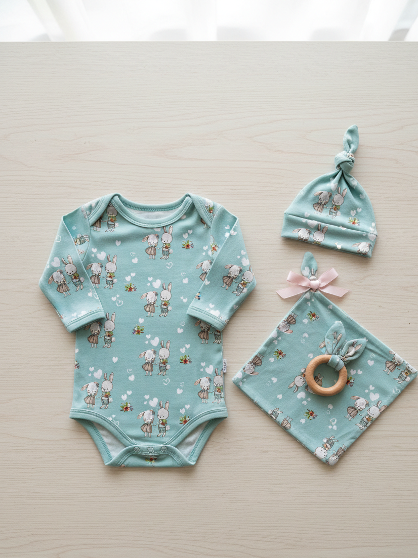 Baby-Ausstattung: Süße Strampler, Pumphosen, Bodys oder gemütliche Schlafanzüge.