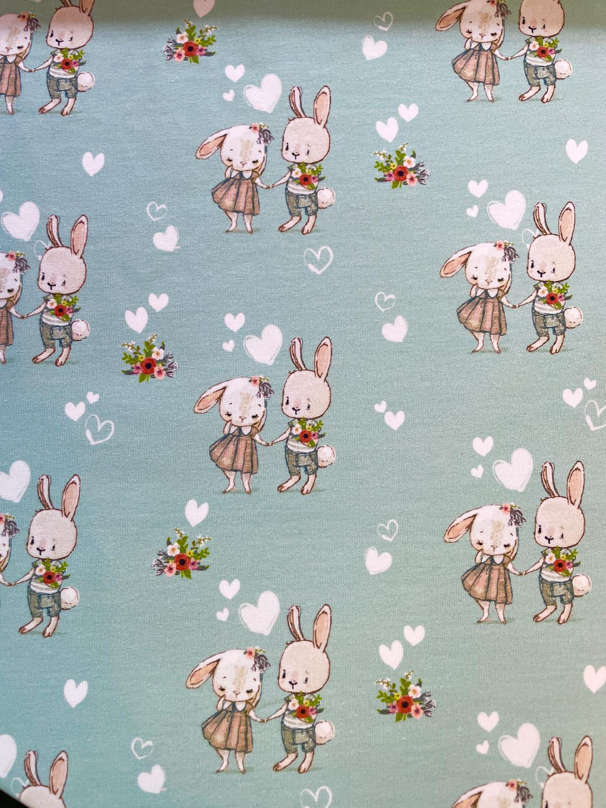 Verleihe Deinen Nähprojekten eine Extraportion Herzlichkeit! Dieser zuckersüße Jersey-Stoff besticht durch sein liebevolles Design: Ein niedliches Hasen-Pärchen, das Hand in Hand über den Stoff spaziert, umgeben von zarten Herzen und kleinen Blumensträußen.