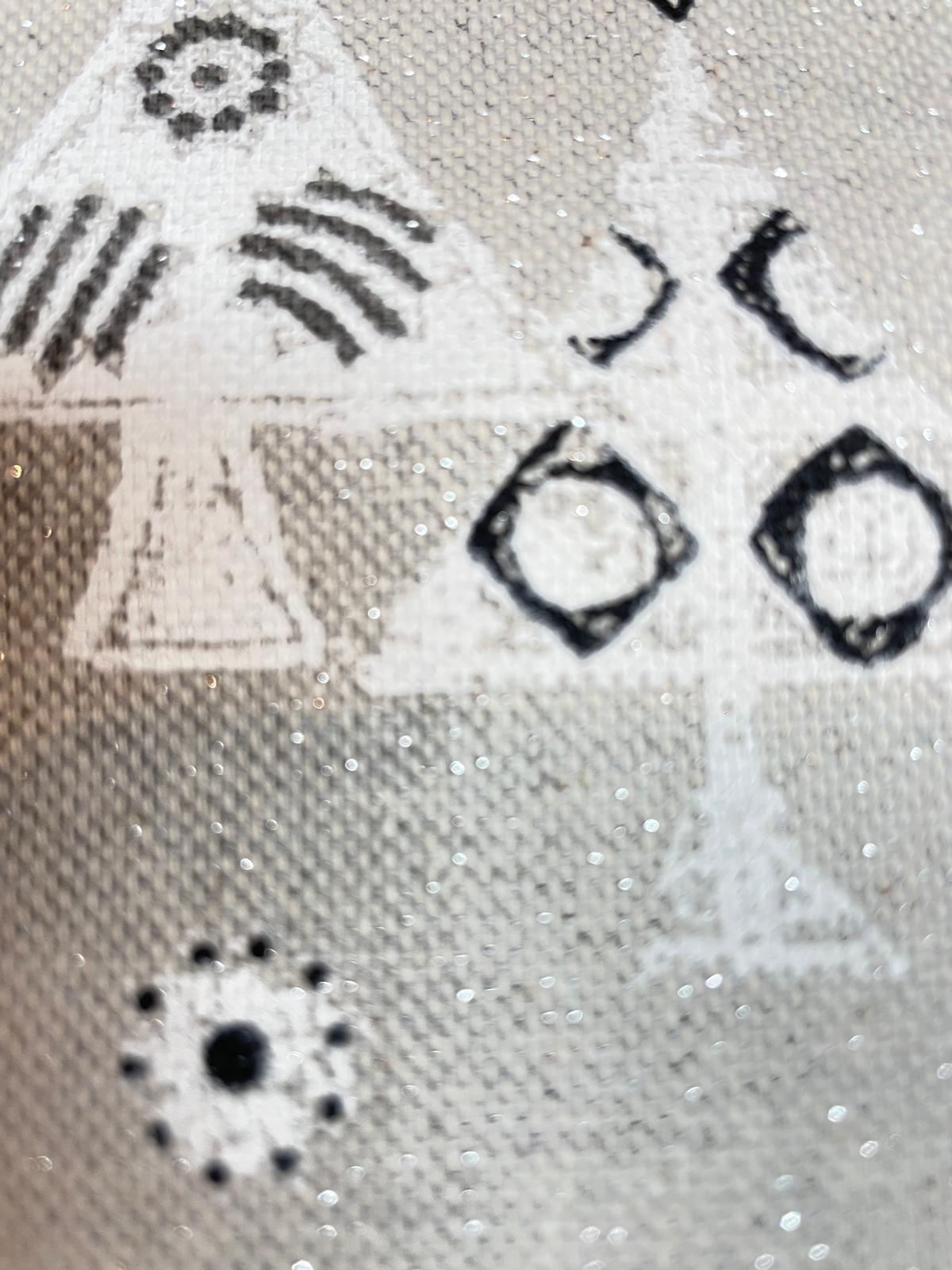 Dieser Stoff ist ein Canvas mit einer charakteristischen, dichten und leicht strukturierten Webart, was ihm einen robusten und strapazierfähigen Griff verleiht. Der Untergrund ist in einem mittleren Grau mit schimmerndem Glitzer gehalten und mit einem kontrastreichen, weißen/schwarzen Design bedruckt. Das Muster besteht aus stark stilisierten Weihnachtsbäumen und großen Schneeflocken. Die Bäume sind mit grafischen Mustern, Kreisen und Strichen gefüllt, was dem Stoff einen abstrakten, Mid-Century- oder Retrostil verleiht. Aufgrund seiner Strapazierfähigkeit und des klaren Designs eignet er sich ideal für Taschen, Kissen, Vorhänge oder weihnachtliche Dekorationen, die Langlebigkeit erfordern.