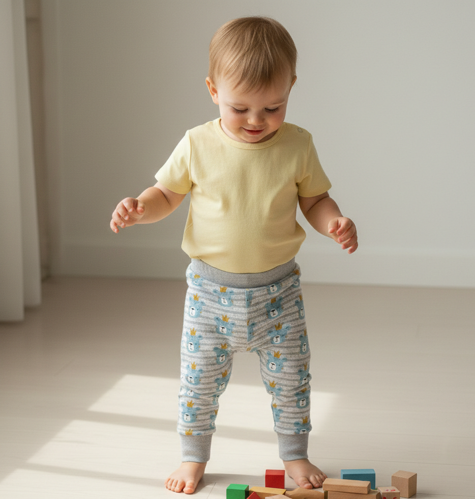 Der Stoff ist dicker als Jersey, aber leichter als angerauter Wintersweat. Die charakteristische Schlingenoptik auf der Rückseite sorgt für ein ideales Hautklima und macht ihn besonders atmungsaktiv. Dank des Elasthan-Anteils ist er wunderbar elastisch, formstabil und weich im Griff – perfekt für zarte Baby- und Kinderhaut.