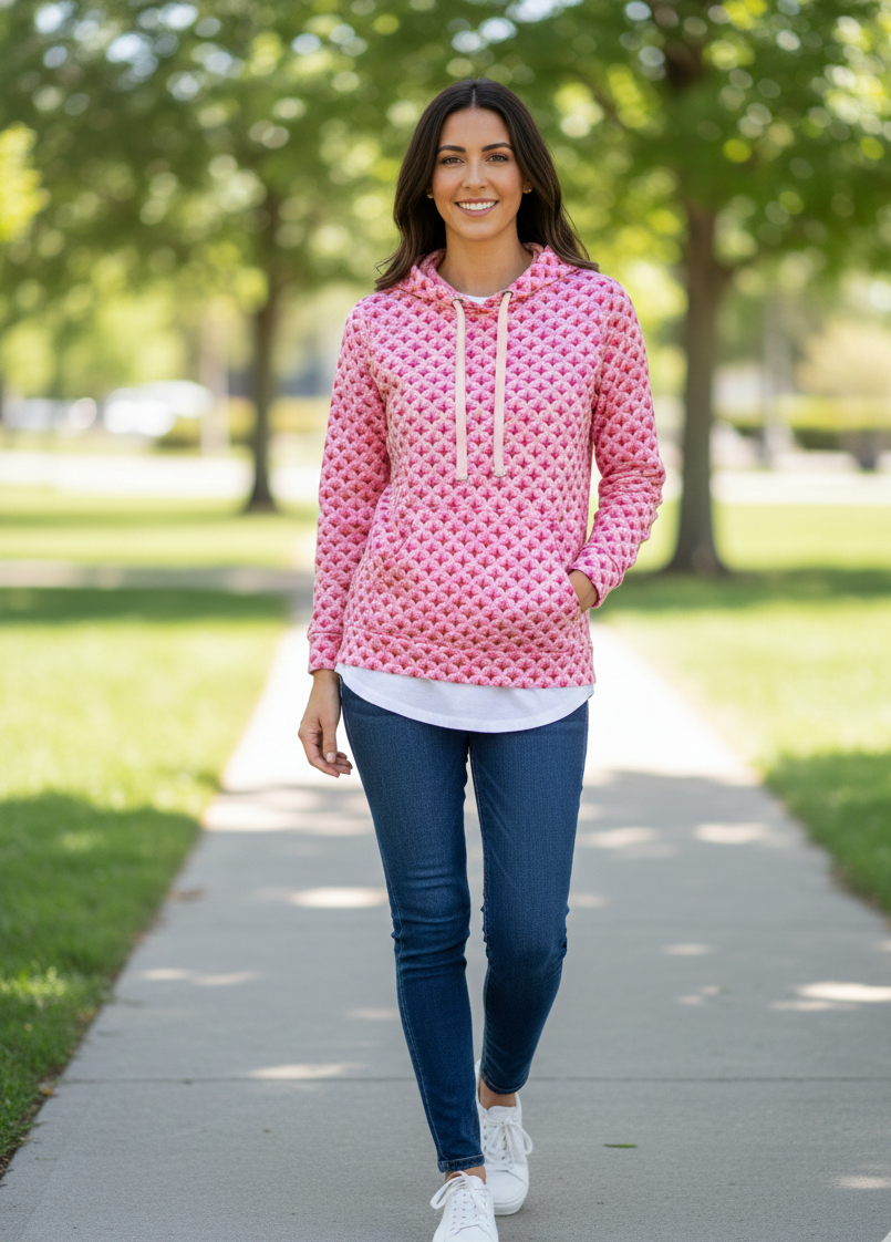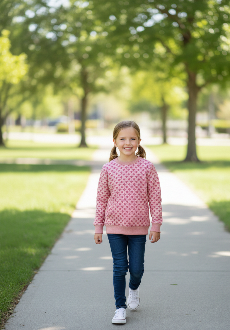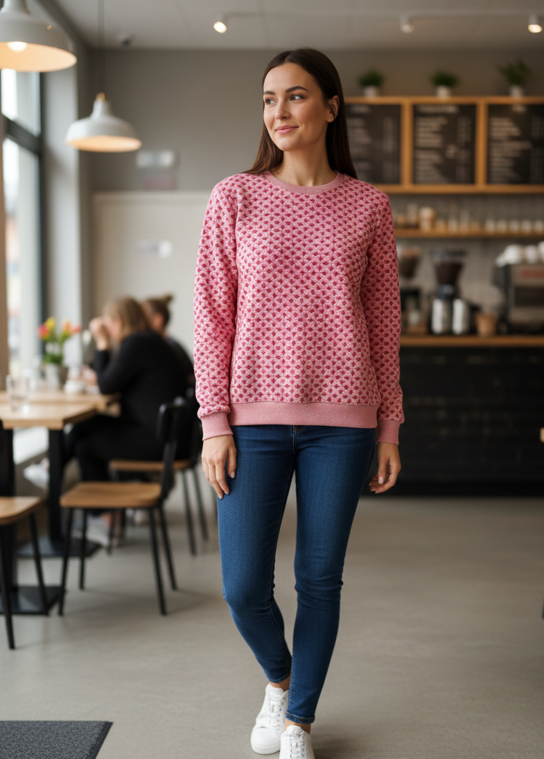 Dieser hochwertige Sommersweat kombiniert ein edles, geometrisches Muster mit dem ultimativen Wohlfühlfaktor. Die harmonischen Beeren-Nuancen auf sanftem Altrosa machen jedes Nähprojekt zum Unikat.