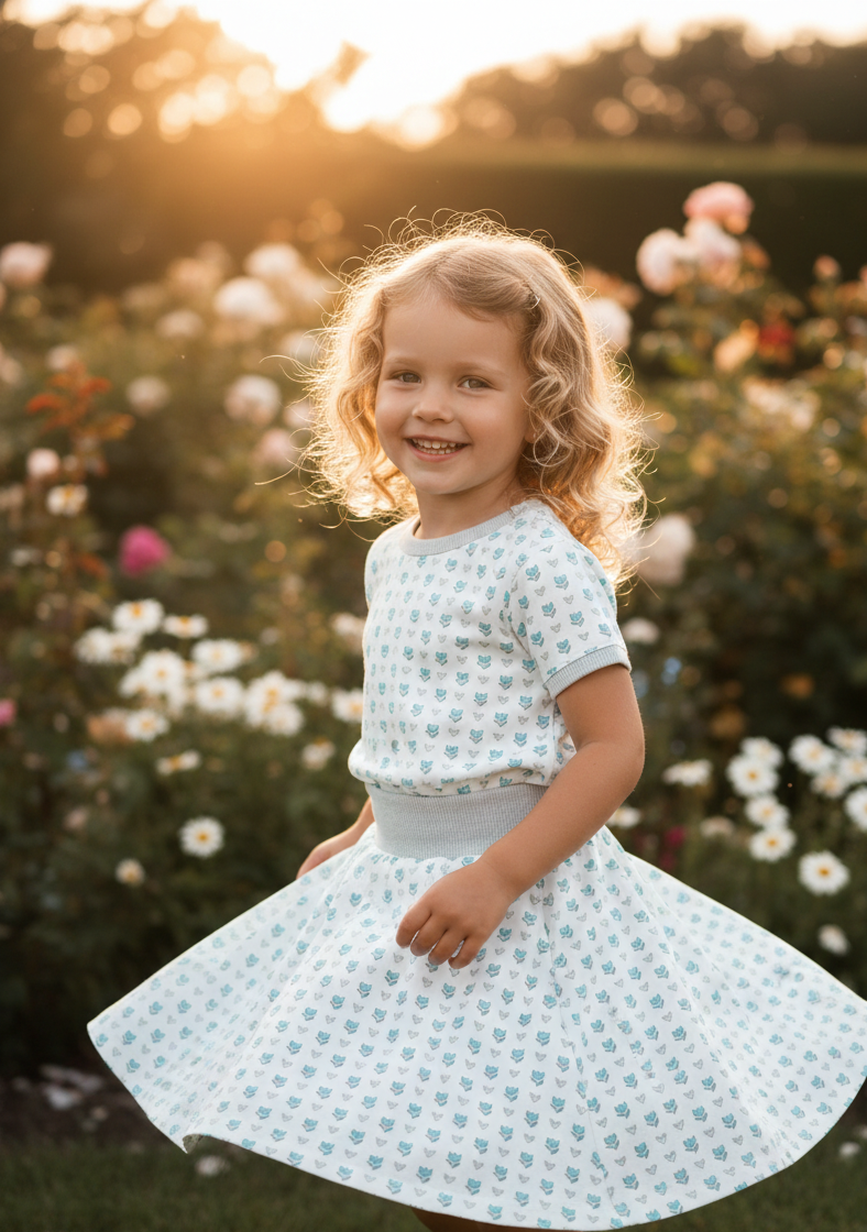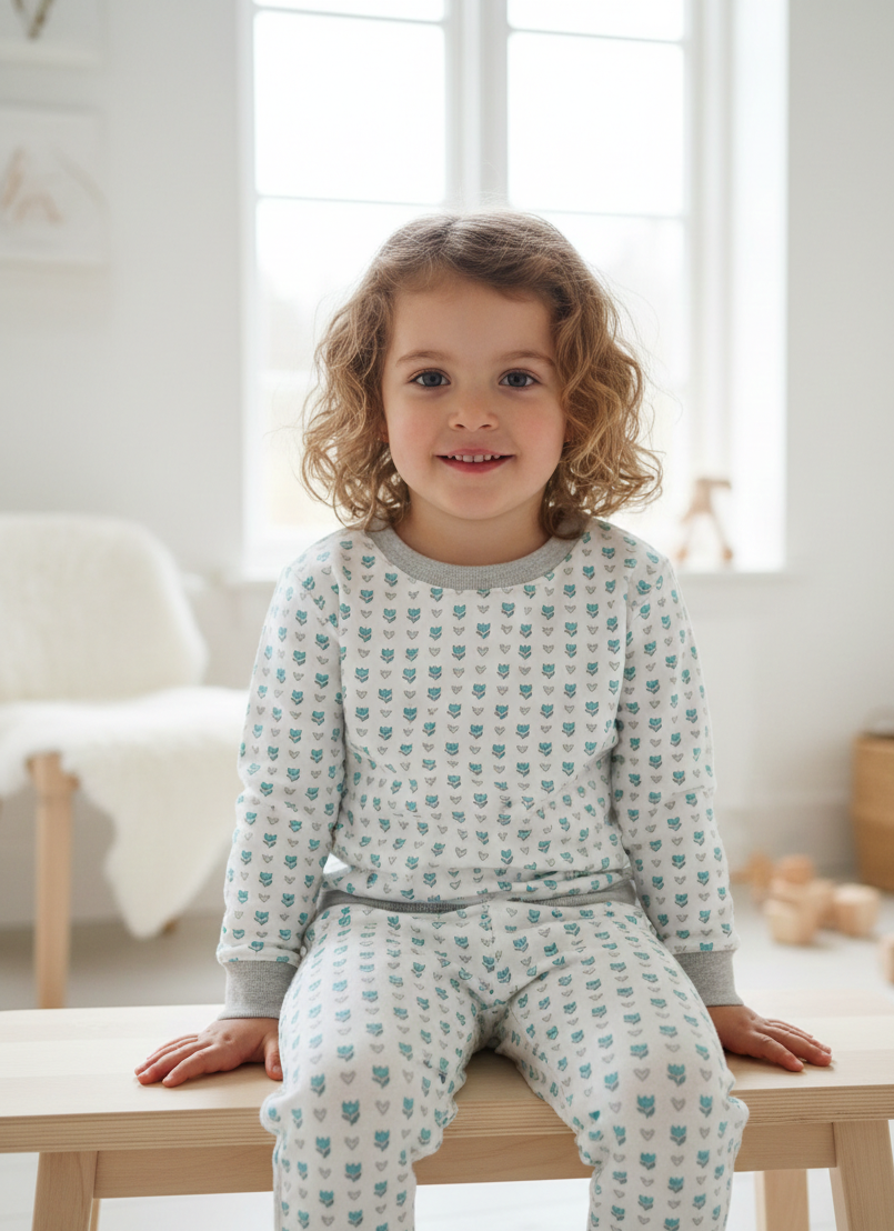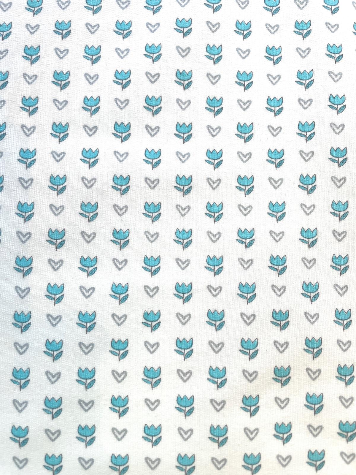 Verleihe Deinen Nähprojekten einen Hauch von Frühling! Dieser French Terry (Sommersweat) überzeugt durch sein dezentes und zeitloses Design: Kleine blaue Tulpen und zarte graue Herzen reihen sich auf einem cremeweißen Untergrund aneinander. Der minimalistische Stil macht diesen Stoff zum perfekten Allrounder für moderne Baby-, Kinder- und Damenmode.
