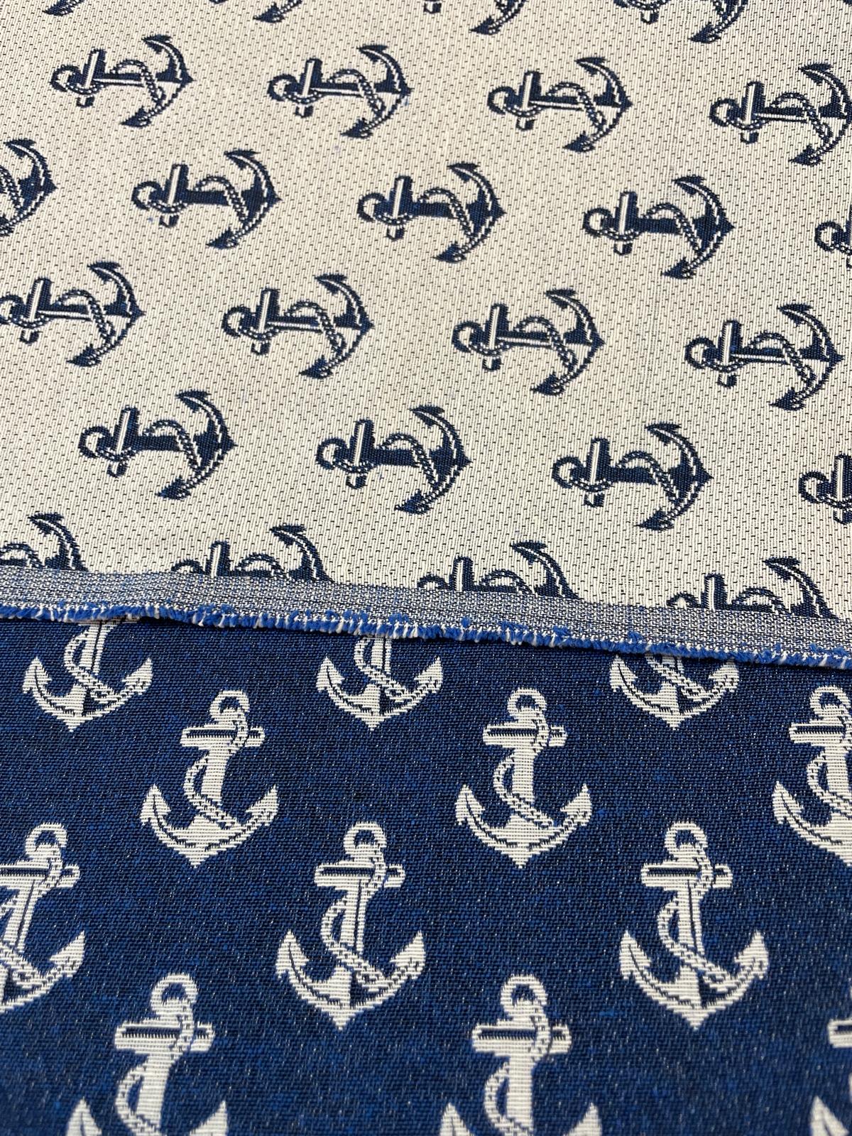 Dieser maritime Gobelin-Stoff mit Ankermotiv besticht durch sein zeitloses Design und seine außergewöhnliche Vielseitigkeit. Dank der aufwendigen Jacquard-Webtechnik ist dieser Stoff beidseitig verwendbar, was Ihnen zwei vollwertige Designoptionen in einem Textil bietet. Auf der einen Seite erscheinen die detaillierten Anker in kräftigem Marineblau auf naturfarbenem Grund, während die Abseite das Motiv in Cremeweiß auf tiefblauem Untergrund zeigt. Die typische, schwere Gobelin-Qualität verleiht dem Gewebe eine hohe Strapazierfähigkeit und eine wertige, griffige Haptik.