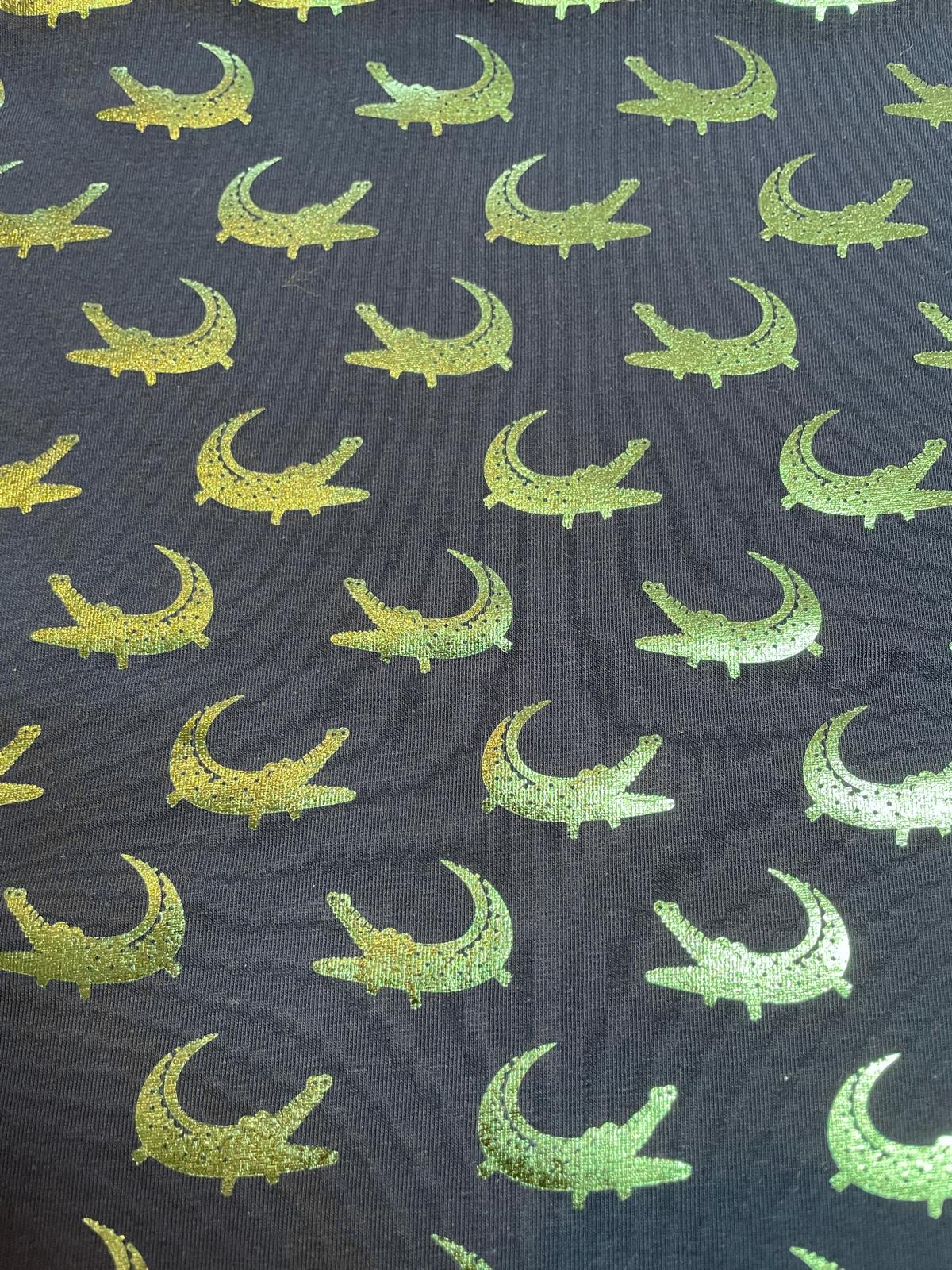Dieser auffällige Baumwolljersey (dehnbarer Maschenstoff) hat eine Grundfarbe in tiefem Dunkelblau. Er ist mit einem Allover-Print aus kleinen, stilisierten Krokodilen oder Alligatoren verziert. Das Besondere ist der schimmernde Folien-/ Glitter-Druck in schimmernden Grün. Der Stoff eignet sich hervorragend für Shirts, Kleider und Accessoires mit Glamour-Effekt.