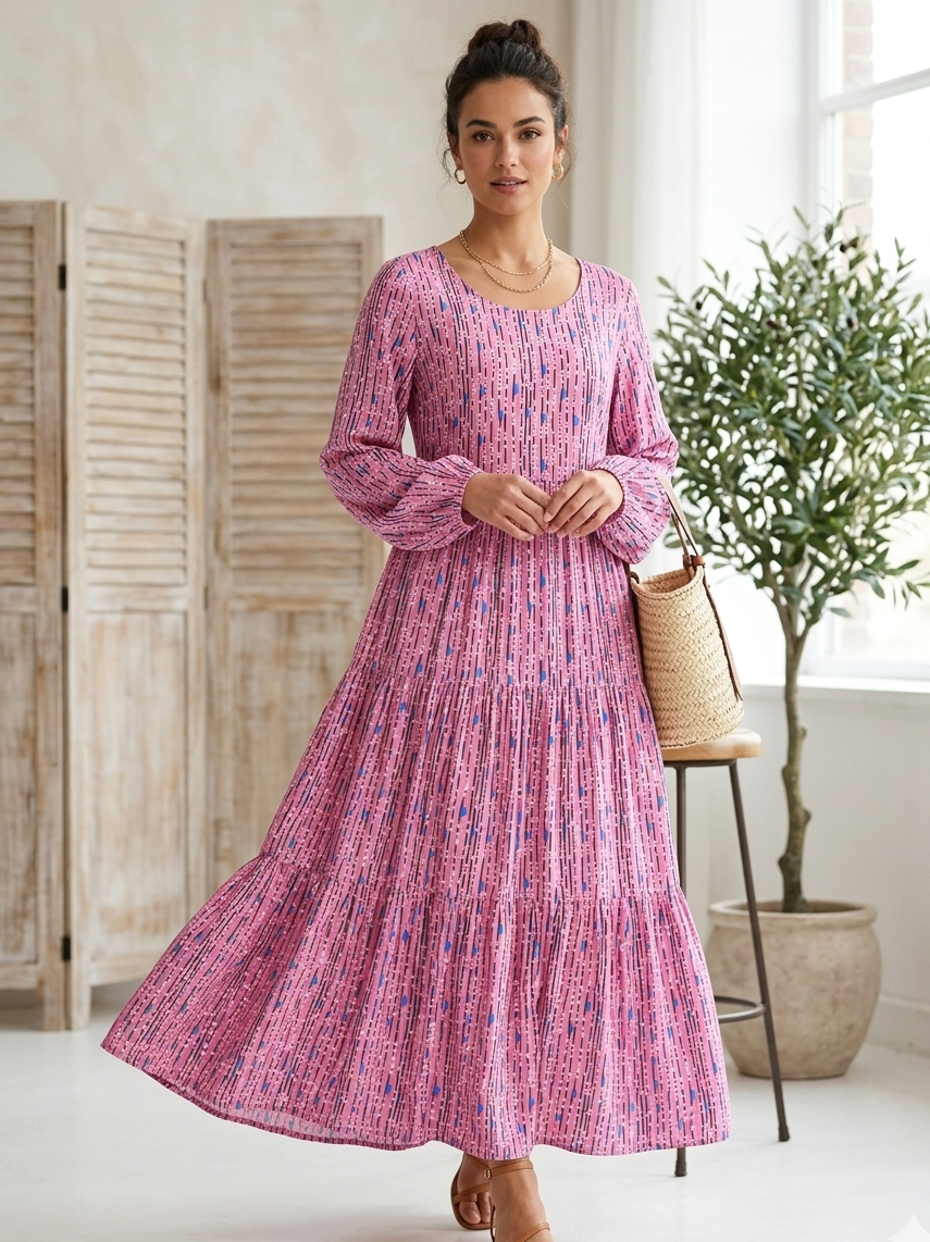 Bringe Farbe in Deine Garderobe! Dieser hochwertige Stoff aus 100% Viskose besticht durch sein lebendiges, grafisches Muster: Filigrane vertikale Linien treffen auf verspielte Pünktchen und leuchtend blaue Akzente auf kräftigem Pink. Mit einer Breite von 136 cm bietet er die ideale Basis für fließende Kreationen.