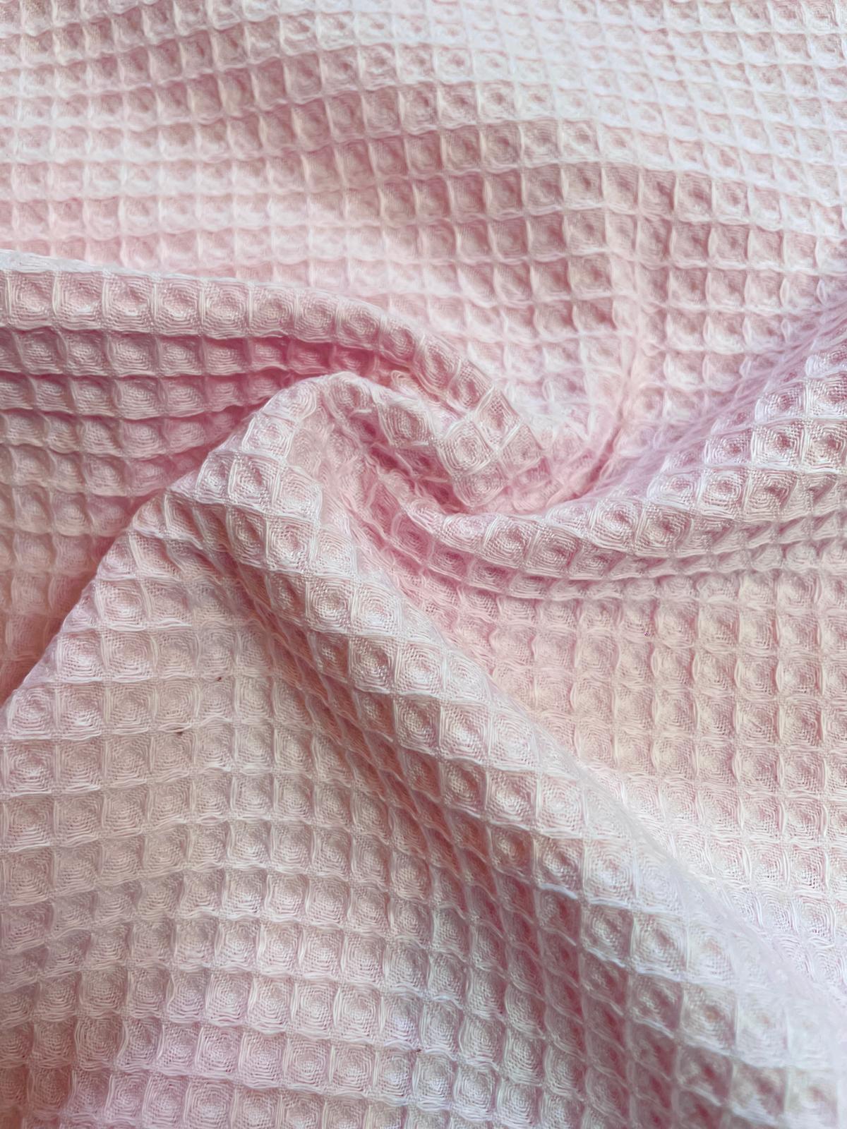 Der Stoff ist ein Waffelpiqué in einem Rosa-Ton. Er zeichnet sich durch seine dreidimensionale, saugfähige Wabenstruktur und seinen weichen, voluminösen Griff aus und ist robust sowie atmungsaktiv.